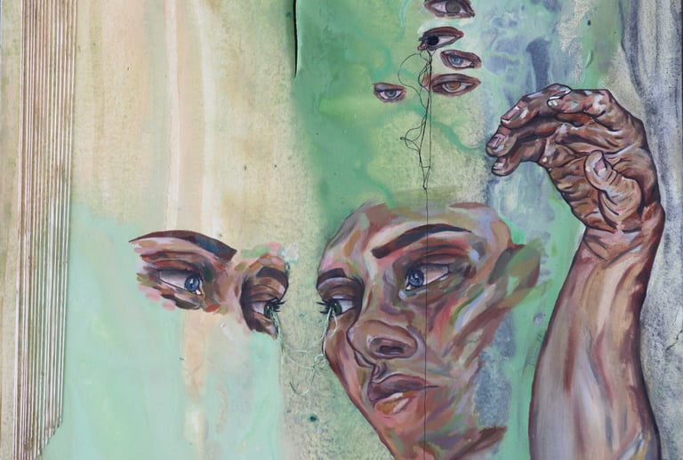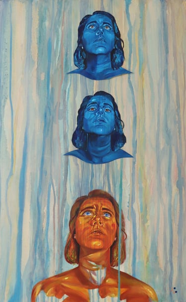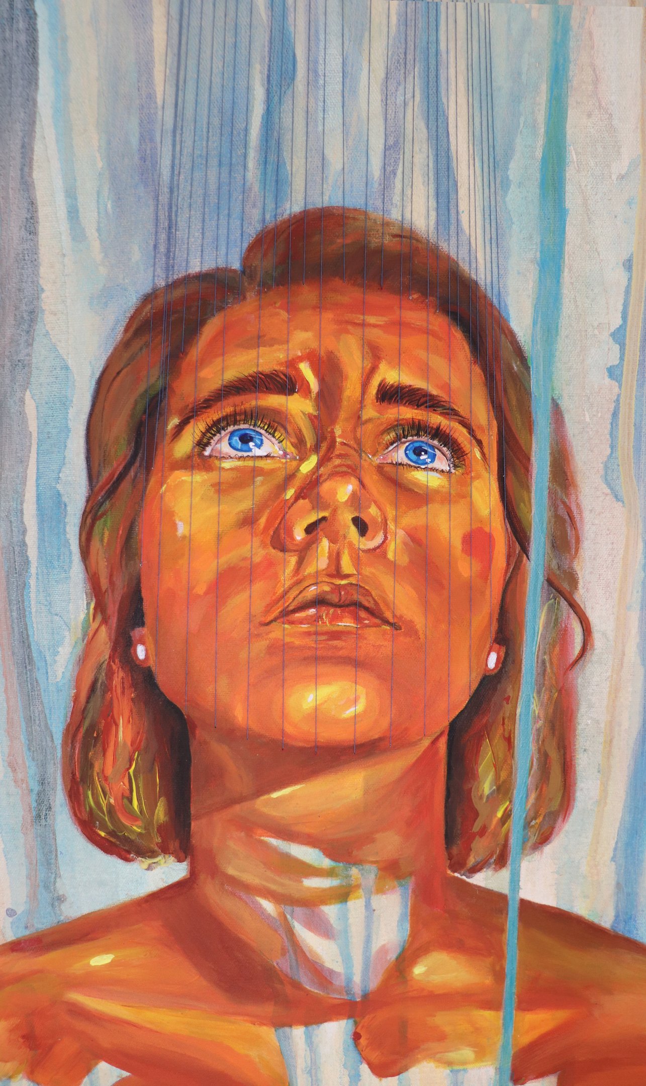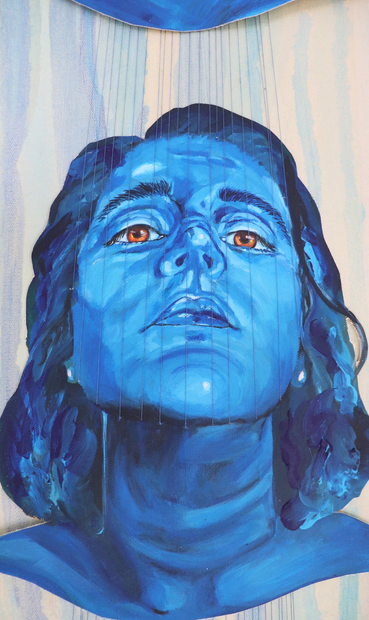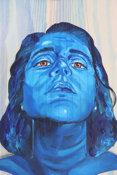 D’un côté, j’y vois un hommage à la persévérance. La figure principale lève les yeux vers le haut ce qui donne l’impression qu’elle veut atteindre les visages bleus. Ils symbolisent donc ses ambitions et le chemin qu’elle construit. Cette lecture donne l’impression que les fils sortent de son corps représentant alors ses efforts et son courage. Son expression d’inquiétude montre qu’elle persévère malgré le fait qu’elle vit des défis dans son chemin ambitieux. Pour moi cet oeuvre inspire à repousser nos limites.