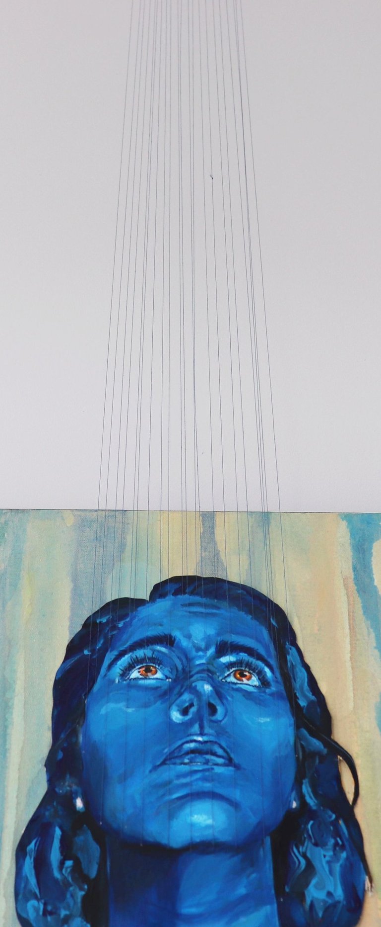 Médium: Acrylique et fils à coudre sur canevas de toile de coton. Les fils à couture sont soutenus par une structure en bois fixée au plafond.