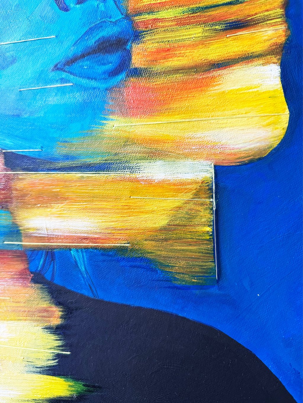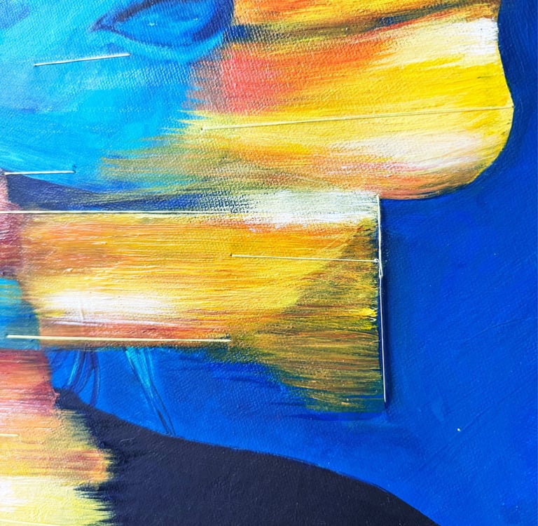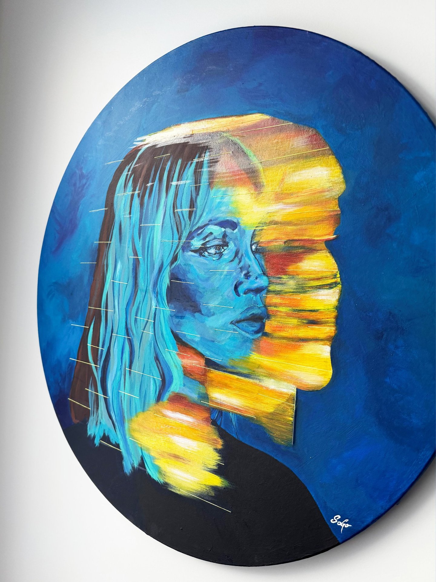 Médium: Acrylique et fils à coudre sur canevas de toile rond. Cette oeuvre évolue selon le moment de la journée grâce au jeu de lumière conçu avec du vernis mat et du vernis extra lustré.