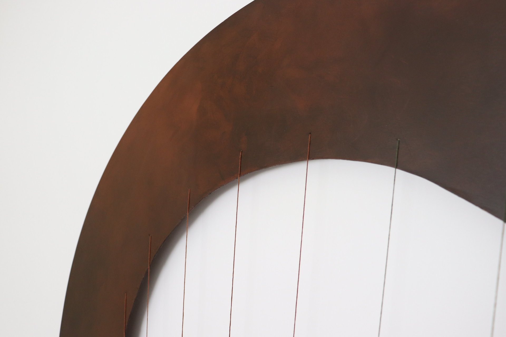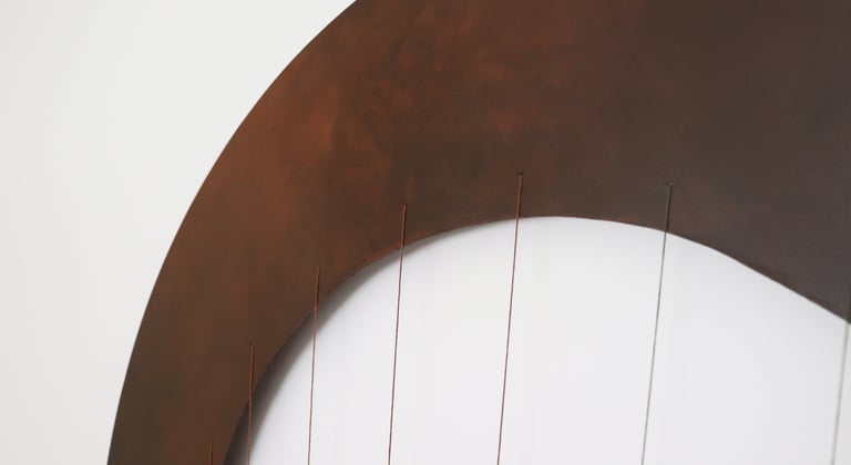 Médium: Acrylique, modeling paste et fils à broder sur un panneau de bois de merisier rond revisité par l'artiste.
